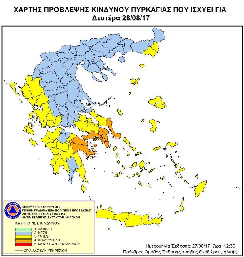 Σύμφωνα με τον Χάρτη Πρόβλεψης Κινδύνου Πυρκαγιάς που εκδίδει η Γενική Γραμματεία Πολιτικής Προστασίας του Υπουργείου Εσωτερικών (www.civilprotection.gr), προβλέπεται πολύ υψηλός κίνδυνος πυρκαγιάς (κατηγορία κινδύνου 4) για τις περιοχές: