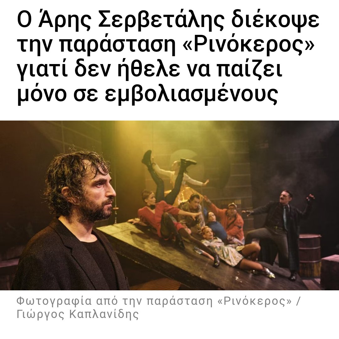 Ο ηθοποιός Άρης Σερβετάλης ανακοίνωσε την διακοπή των παραστάσεων της παράστασης «Ρινόκερος», του Ευγένιου Ιονέσκο σε σκηνοθεσία Γιάννη Κακλέα, καθώς απέρριψε την απόφαση της κυβέρνησης να φτιάξει θέατρο δύο ταχυτήτων μόνο για εμβολιασμένους, αφήνοντας εκτός τους ανεμβολίαστους!
