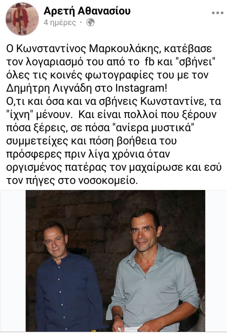Ο Κωνσταντίνος Μαρκουλάκης, κατέβασε τον λογαριασμό του από το fb και "σβήνει" όλες τις κοινές φωτογραφίες του με τον Δημήτρη Λιγνάδη στο Instagram!