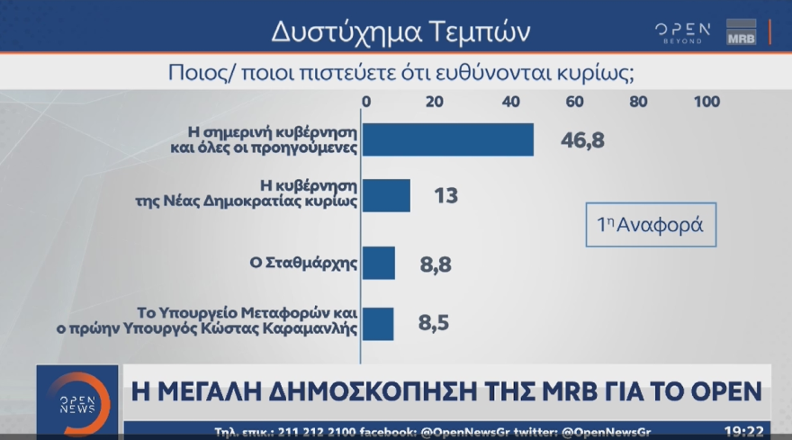 Το 62,5% αξιολογεί πολύ ή αρκετά αρνητικά τη στάση της κυβέρνησης και του πρωθυπουργού Κυριάκου Μητσοτάκη, μετά τη συγγνώμη που διατυπώθηκε για το δυστύχημα, ενώ το 27,5% την αξιολογεί θετικά ή μάλλον θετικά.