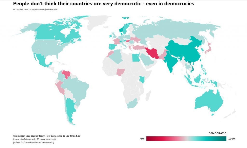 Η Ελλάδα, η γενέτειρα της δημοκρατίας, θεωρείται από τους πολίτες της σε ποσοστό 43% λιγότερο δημοκρατική