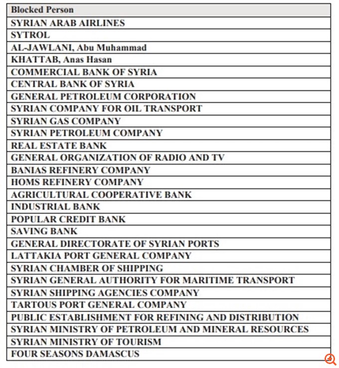 Την ίδια στιγμή, "επιτρέπει επίσης όλες τις συναλλαγές με τη νέα κυβέρνηση της Συρίας".