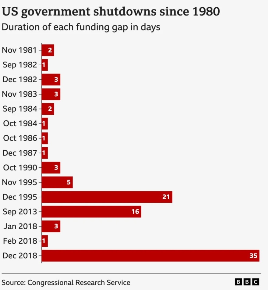 Από το 1980 έχουν καταγραφεί 15 shutdowns, πλήρη ή μερικά, καθώς κάποιες υπηρεσίες είχαν διασφαλισμένη χρηματοδότηση, ενώ άλλες έμεναν χωρίς λειτουργία. Το επικείμενο θεωρείται πλήρες shutdown, καθώς καμία από τις 12 νομοθετικές πράξεις που συνθέτουν τον προϋπολογισμό δεν έχει περάσει από τη Βουλή και τη Γερουσία.