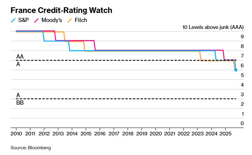 Η Γαλλία έχει υποστεί σειρά υποβαθμίσεων τις τελευταίες εβδομάδες, συμπεριλαμβανομένων αυτών από τη Fitch και τη DBRS, καθώς η παρατεταμένη πολιτική αστάθεια κινδυνεύει να μετατραπεί σε κρίση δημόσιων οικονομικών.